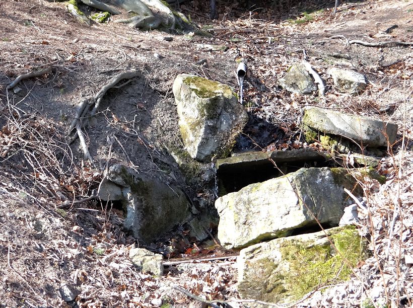 Květen 2025 - studánka bez vody a zřejmě dlouho. Z plastové trubky ani kapka vody. Z mříže, která kryje odtok vody je slyšet kapání vody, asi voda prosakující z prameniště - aktuální foto.