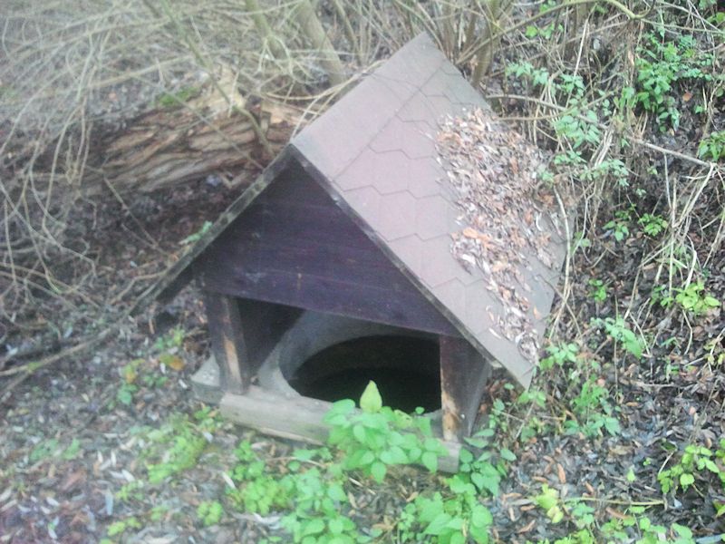 Zastřešená studna se nachází na okraji vodní plochy při červené značce nedaleko rozcestníku Kokořín - dolina.