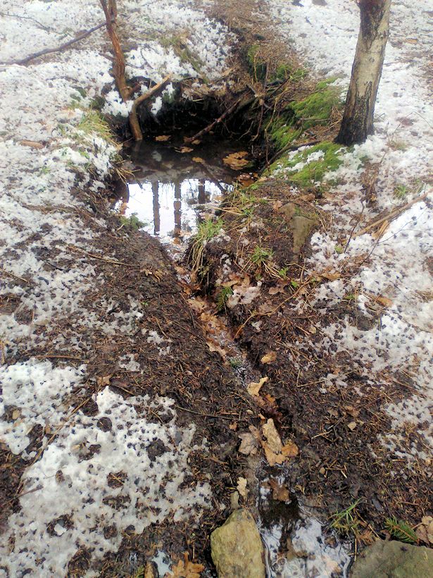Malá studánka při lesní cestičce na Malý chlum. Bývá zapadaná listím a větvičkami, tak ani neláká k napití, ale pokud by se pořešil odtok do trubky a zastřešila se, asi by to vypadalo jinak.