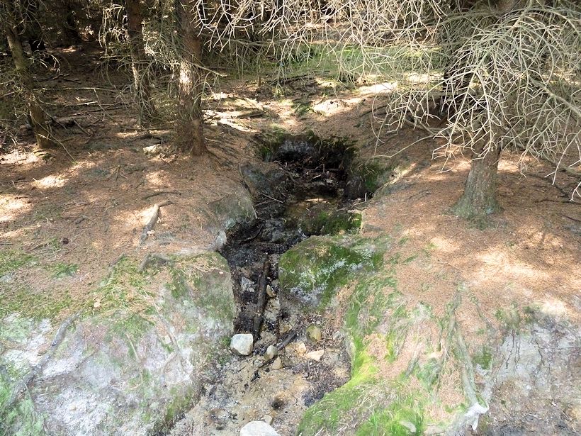 Pramen potoka, přestože nedaleko hřebenu je dostatečně silný - vhodný k úpravě na studánku.
