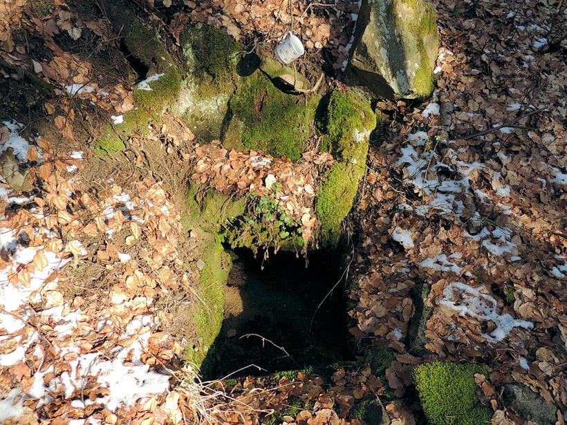 Červenec 2021 - studánka již má pěkný přístřešek, jsou z ní vyvedeny dvě trubky. Voda tekla jen z jedné z nich, ale velmi slabě, neboť bylo docela sucho. V ještě větším suchu zřejmě nepoteče vůbec.