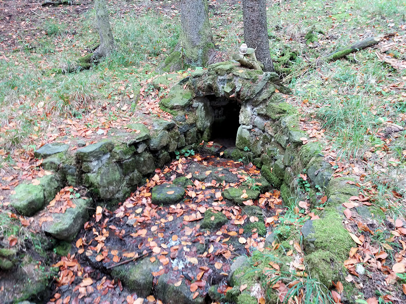 Pramen pod kořeny stromu. Uvnitř je mezi kořeny trubka, do které se o metr dříve stahuje voda. Terén kolem stromu je propadnutý, takže je druhý konec trubky vidět mezi kořeny. Při deštích se pravděpodobně stahuje i voda z povrchu kopce. Koryto v prvních 5m upraveno kameny. Při návštěvě z trubky vytékala čistá voda, ale nezkoušel jsem ji.