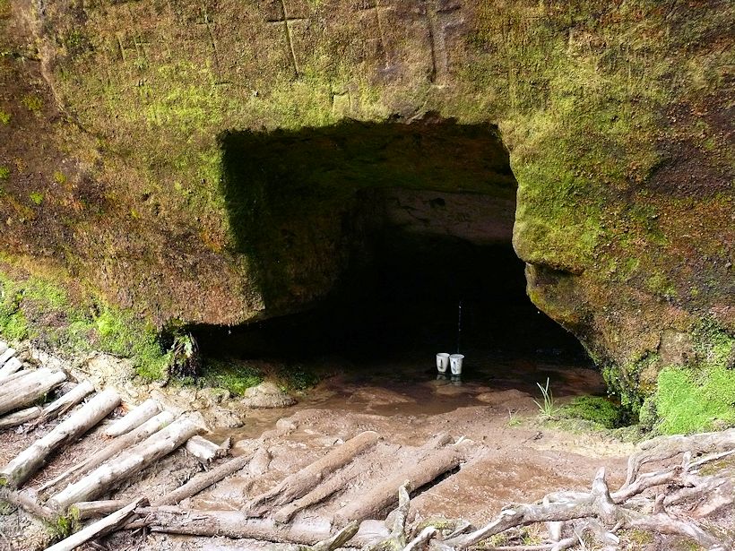 Únor 2024 - voda teče z trubky i okolo ze skály. Dřevěný most se už zase trochu rozpadá. Místo je úchvatné. Aktuální foto: Lukáš Heger