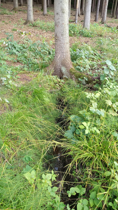 Říjen 2020 - místo odpovídá popisu autora záznamu. U většího smrku začíná vlhký zářez, který asi po 4m překonává lesní cestu. V cestě jsou patrné ještě rozježďené betonové trubky a pod cestou vyschlá tůň. Je jasné, že zde dříve býval vodní zdroj. Bohužel těžba dřeva místo poničila a voda se tam již nevrátila. Aktuální foto Jakub Spína