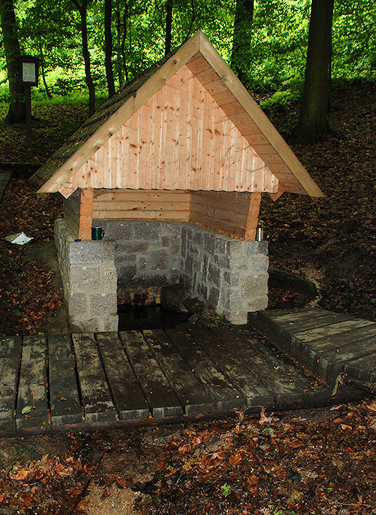 Srpen 2025 - studánka a okolní dřevěné chodníky prošly renovací, přibyla i dřevěná lavička a hrábě na čištění od listí, aktuální foto M. Vaníček