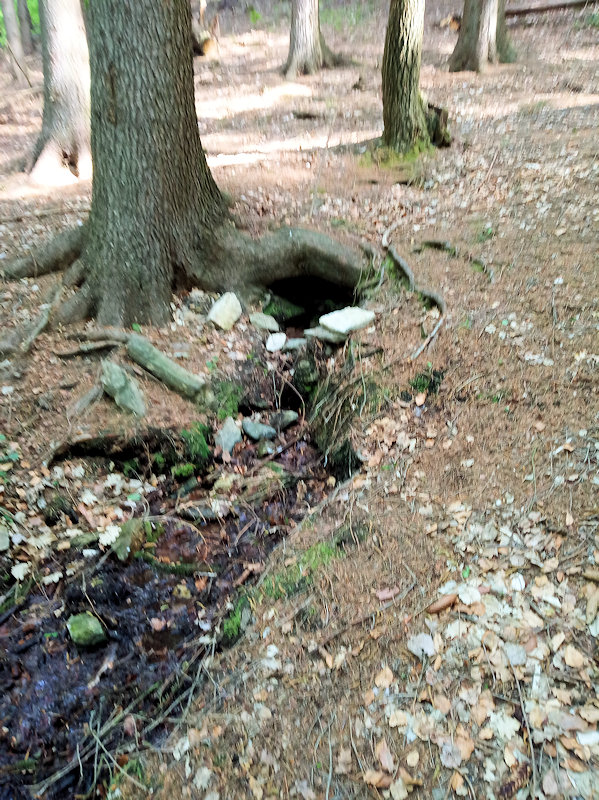 Září 2022 - voda teče stabilním proudem po celý rok. Pravděpodobně jde o vodu z blízké studánky nad cestou, která vysychá.