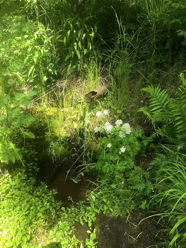Když jdete po červené značce proti proudu Mže odbočíte do kopce po zelené značce, potůček je hned vedle cesty a vpravo u cesty je trubka odkud teče voda.