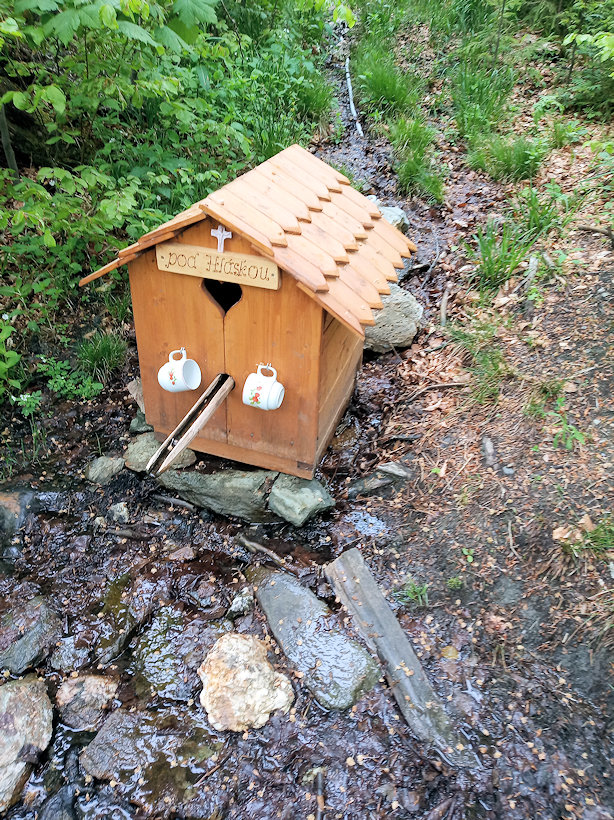 Srpen 2023 - studánka bez vody, pravděpodobně ucpaná hadice přivádějící vodu z potůčku