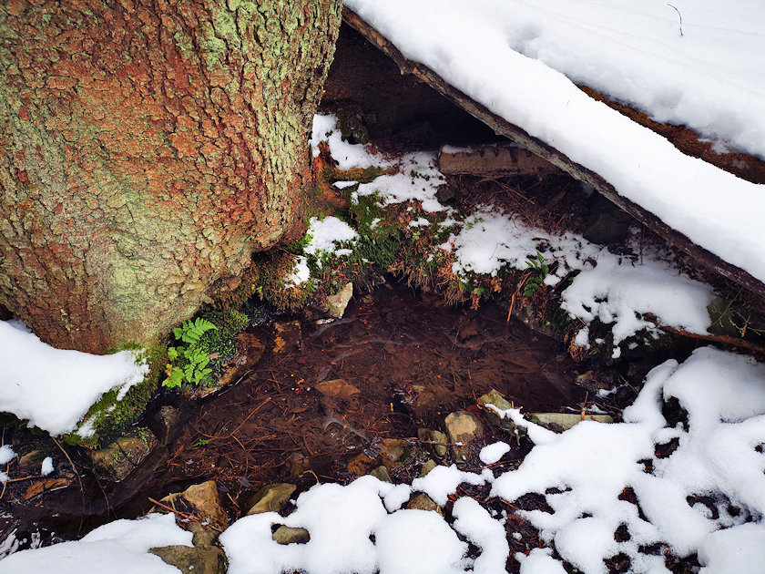 Duben 2025 - stříška z větví prořídla, voda zapáchající. Bez nářadí, jen se silnou větví jsem uvolnil odtok vody a pročistil dno od šišek a napadeného listí. Je vidět že voda u dna pod okrajem břehu vyvěrá.