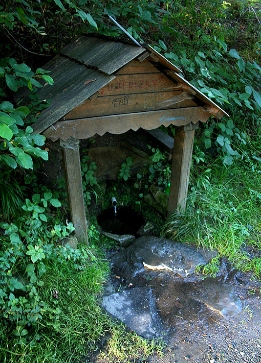 Studánka s čistou vodou u žluté turistické značky z Pržna na Lázy.