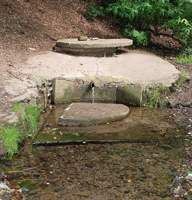 Červen 2023 - voda si našla cestu kolem betonového tělesa a protéká pod zemí přímo do potůčku. Bylo by potřeba skruž obkopat a zatěsnit jílem.