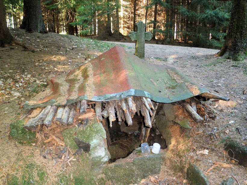 Duben 2017 - studánka je v žalostném stavu, spadla její stříška, zcela ztrouchnivělá. Je suchá, vyčistili jsme ji, ale se stříškou jsme si zatím neporadili. Aktuální foto: Schmidovi