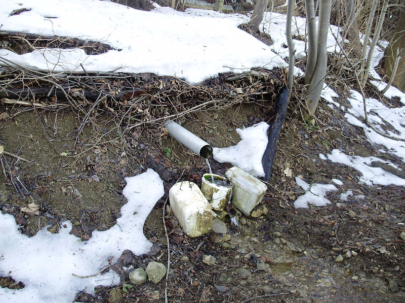Červenec 2024 - původní pramen stéká do studánky. Vyčistil MOP Pramínek.