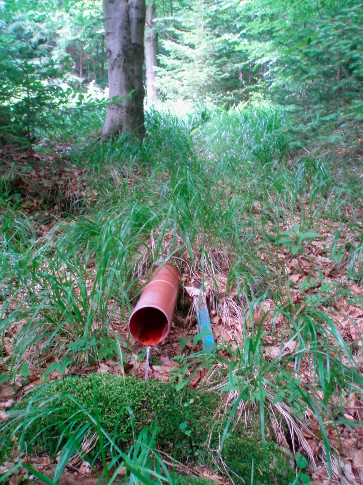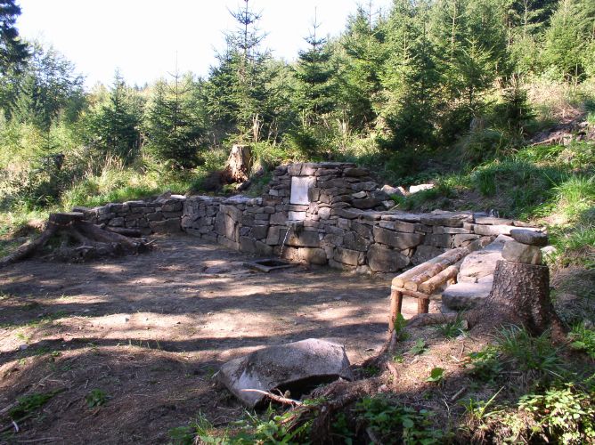 Srpen 2014 - na pařezu v levé části fotografie přibyla dřevěná socha, na prostranství před pramenem se vytvořila mokřina, lavička zmizela, místo ní je tu kláda. Voda je chuťově velmi dobrá, pramen jí chrlí 3 litry za minutu o teplotě 7°C. Pramen je dostupný pouze po Stezce živé vody. Foto a poznámka Martin Mlečka.