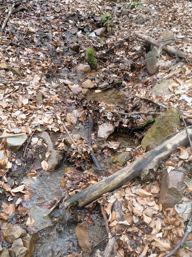 Prvním přítokem (byť občasným) Chomutovky v Bezručově údolí ve směru od Chomutova je bezejmenná bystřina v levém svahu. Její koryto je hluboce zaříznuto, a tvoří tak cca 700m dlouhou rokli s větším spádem. V jejím průběhu si vytvořili vyznavači extrémního sjezdu na kole tréningovou trať. Potůček se objevuje zhruba ve střední části rokle mezi napadaným listím a kameny a po pár desítkách metrů končí cca o 100m níže v Chomutovce. Tento stav (březen-duben) ovšem neplatí po celý rok, po většinu roku je rokle suchá kompletně, popř. se vodoteč objevuje jen v průběhu několika málo metrů ve střední části, aniž by dospěla do Chomutovky. Uvedený vývěr ve skutečnosti souvisí s prameny Pod Krásnou Lípou 1,2 a 3, U cesty a Puklinový pramen pro které je souhrnným vývěrem po jejich částečném znovuzmizení v podzemí.