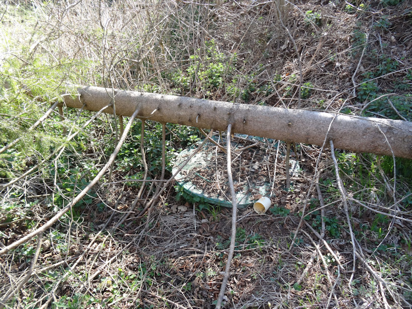 Duben 2020 - cedulka je pryč, stejně jako les okolo. Studánku už najdou jen co si pamatují místo, kde byla. Zpustošené místo.