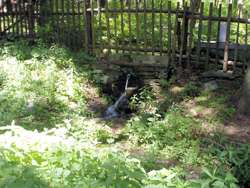 Srpen 2015 - voda neteče, plot v pozadí zmizel. Po cestě se nacházejí ještě tři studny, patrně vodovodní jímky, dvě z nich s přepadem, obě vyschlé.