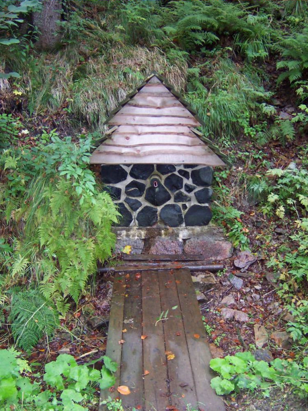 Červenec 2016 - stavba studánky zničena, z trubky jen kape.