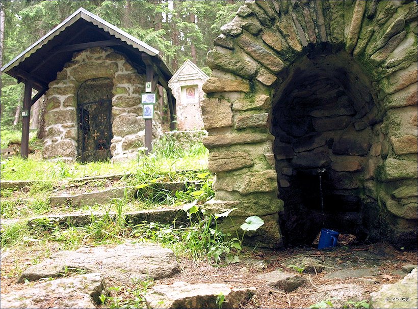 Zázračná voda vyvěrá v kamenné jeskyňce vedle Jeskynní kaple (Grottenkapelle) z r. 1892, která je posledním zastavením křížové cesty, obnovené péčí státního podniku Lesy České republiky, lesní správa Kaplice, v l. 2001-2004 v rámci akce "Program 2000". Přístup po křížové cestě a zároveň žlutě značené turistické trase č. 6400 od TIM Cetviny, kostel k TIM Cetviny, CZ/A u hraničního můstku přes říčku Malši na pěším a cyklo přechodu do Rakouska, 2,5 km. Na informační tabuli u nedaleké Farské kaple z r. 1827 je uvedena pověst dokládající léčivé účinky vody známé údajně od r. 1616. Manželé ze Štýrska měli nemocné dítě. Ve snu se jim živě zjevil pramen, nacházející se v jihočeských hraničních lesích. Manželé podnikli i se svým dítětem dlouhou cestu k tomuto prameni. Poté, co v něm dítě vykoupali, došlo k jeho uzdravení. Díky této pověsti se místní obraceli k Panně Marii s prosbami o uzdravení.