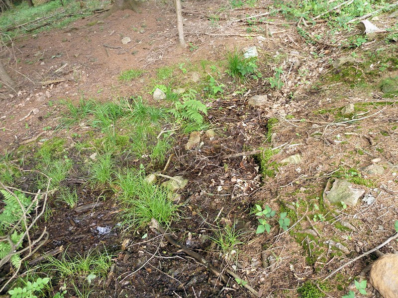 Září 2025 - voda se v prameni drží asi i díky černému igelitu který je po spádu mezi kameny které ohraničují prameniště, foto: Sedumsed