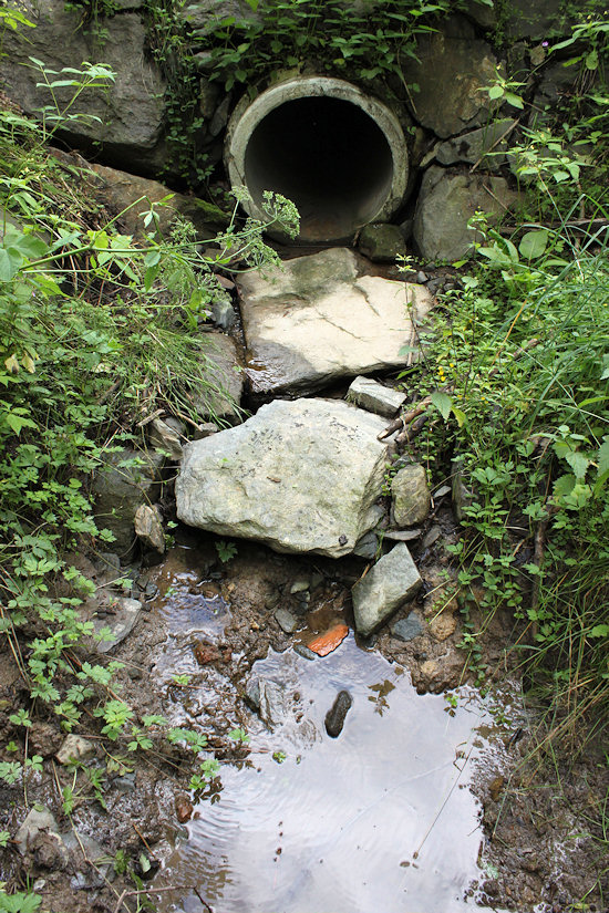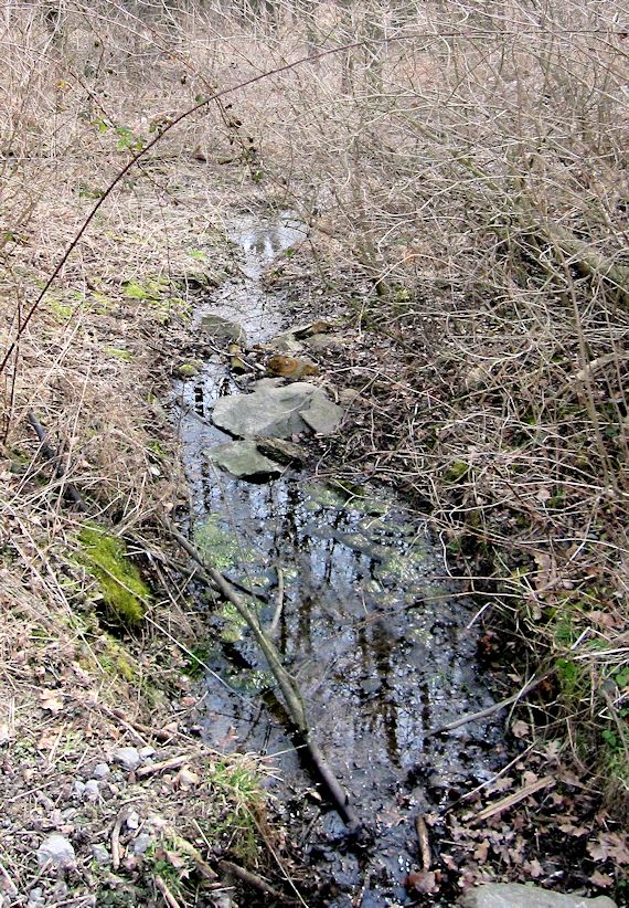 Leden 2025 - pramen vytéká z roury pod silničkou. Voda rozhodně nebude pitná.