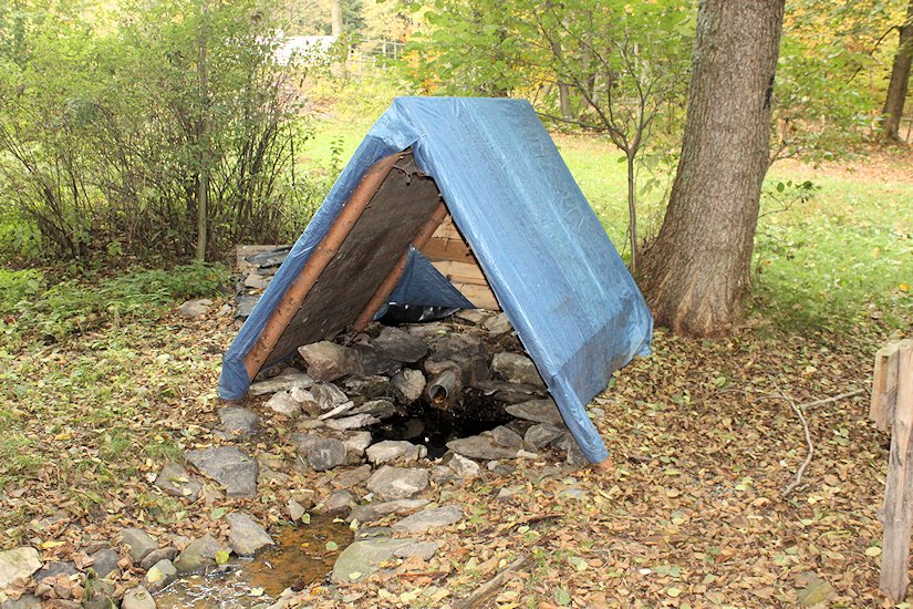 Květen 2021 - studánka neteče rourou, ale voda protéká pod zatěsněním, takže napít se nedá, aktuální foto Luděk Heger