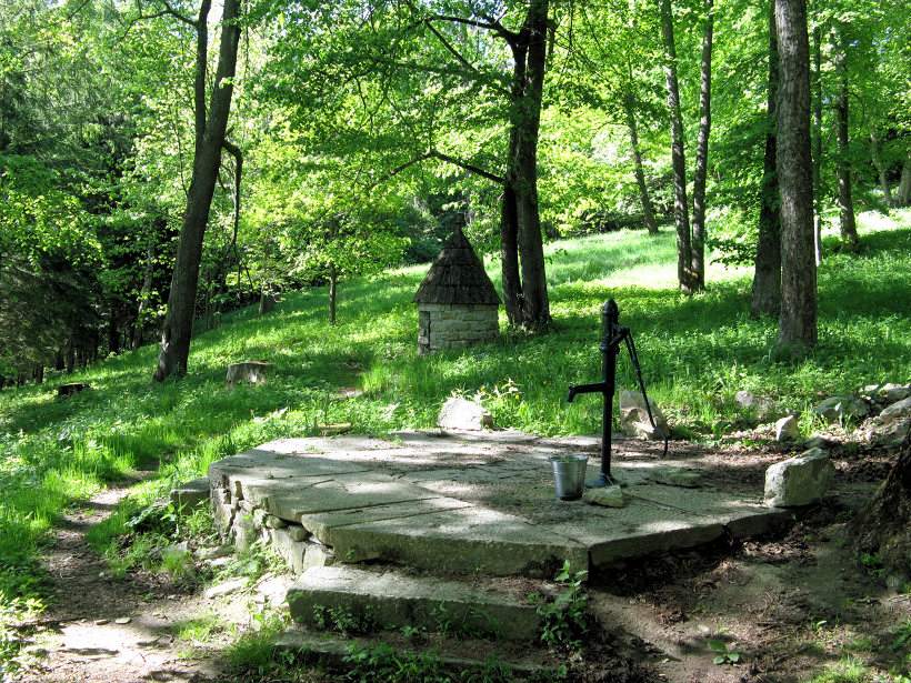 V lesoparku nad městem Horní Planá se pod vrcholem kopce Dobrá Voda (862 m) se vedle pozdně barokního poutního kostelíka Panny Marie Sedmibolestné z let 1777-79 nachází studna zázračné vody se stříškou a zamčenými dvířky (na snímku v pozadí). Vedle studna s funkční pumpou a vědrem. Poblíž rozcestí modře značené pěší turistické trasy č. 1231 a naučné stezky Adalberta Stiftera č. 3398.