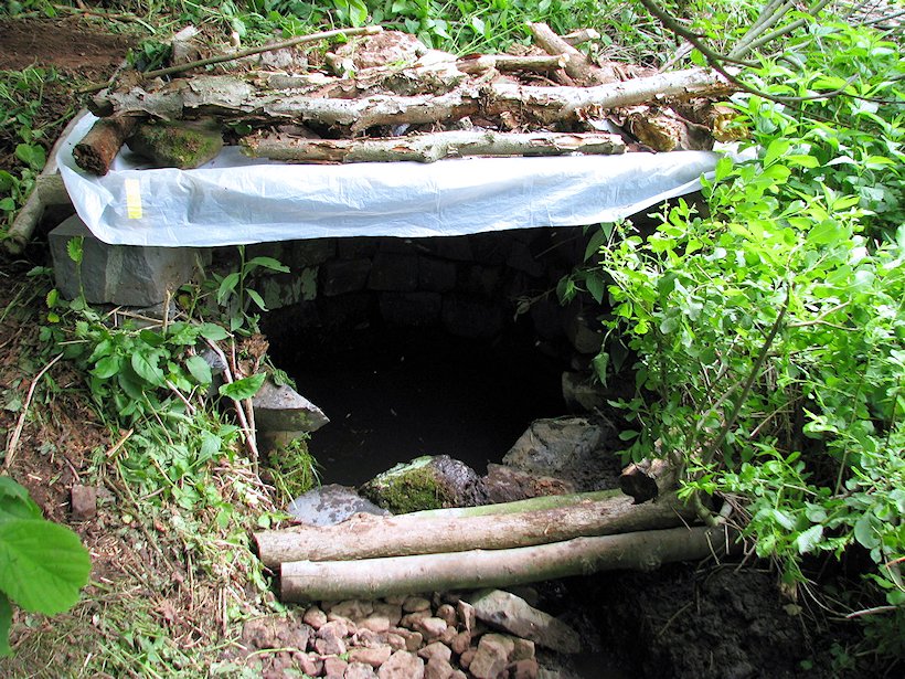 Únor 2016 - studánka čistá v relativně dobrém stavu schovaná pod plachtou, na fotkách to vypadá hůře než ve skutečnosti.