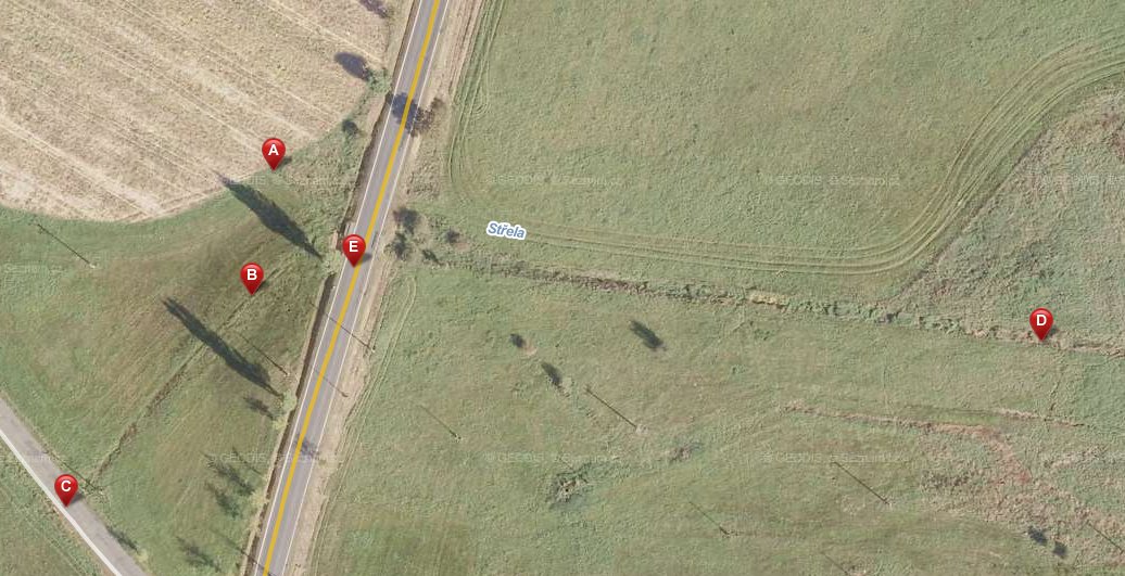 Schematicky je vše na této mapce. A - Vyústění trativodu - suché. B - plošný výstup vody z podzemí - suché C - odvodňovací strouha s propustkem - rovněž suchá, s pramenem nemá nic společného, pouze odvádí přívalové vody z louky. D - první průsaky podzemních vod do koryta E - silnice od Toužimi