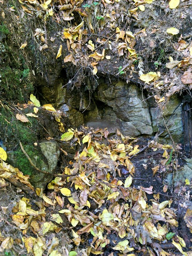 19.08.2014 - Kolem studánky a pod ní v potoce jsou rozházeny zbytky igelitů. Voda ze skály odkapává velmi pomalu a není snadné ji nabrat. (Vojťák)