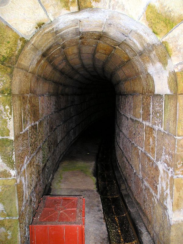 Vlastní pramen "Koellborn" (v překladu - kolotavý, vířivý pramen) je již přes sto let vodárensky využit. V okolí se, na fotografii v místě "A", nachází přepad z vodárny a litinová odvzdušňovací trubka. V místě "B" se nachází prameniště potůčku. Foto vnitřku štoly z roku 2011.