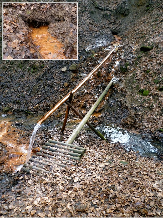 Voda vytéká ze zřícené štoly starého železnorudného dolu Šavel z roku 1811, překonává dřevěným miniakvaduktem Černovský potok a vytéká ze žlabu druhé straně potoka na pohodlně přístupném místě. Voda je silně železitá a způsobuje charakteristické zabarvení všeho v okolí. Nejlépe rezavé usazeniny vynikají na vodopádovém stupni, který se nachází jen kousek pod pramenem.