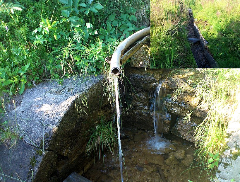 Duben 2020 - hadice chybí, voda stéká po zrezivělém okapu. Průtok se rovněž zmenšil, ale stále voda aspoň trochu teče. Aktuální foto Petr Vondráček
