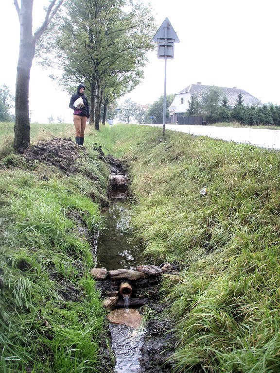 Srpen 2025 - po přelivu není ani památky, významný pramen nyní vyvěrá zcela nepovšimnut v příkopu. Vydatnost v suchém období výrazně poklesla na cca 3 l/min, voda se posunula o pár metrů níže; aktivita zůstává obdobná, 2,0 kBq/l 222Rn. Aktuální foto: Martin Mlečka