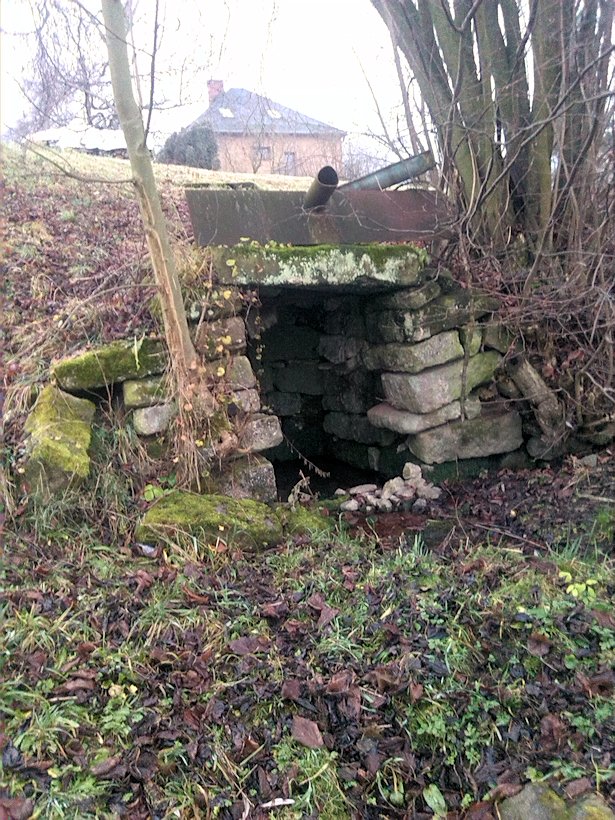 Zděná stavbička pod stromem, ze které vytéká pramen přímo do rybníčka u silnice. Aktuální foto (červenec 2015): Jan Řezníček