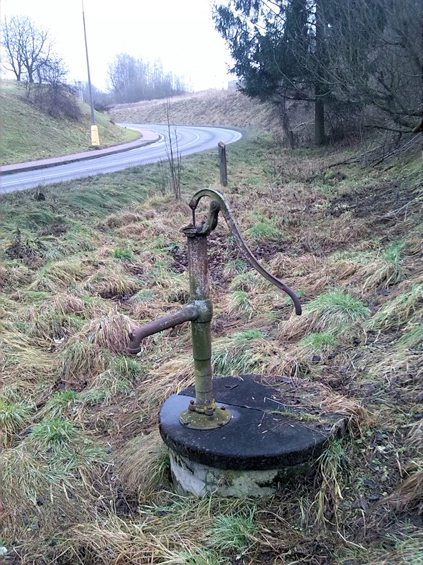 Funkční studna s nevábně vypadající pumpou mezi hlavní silnicí a železniční tratí.