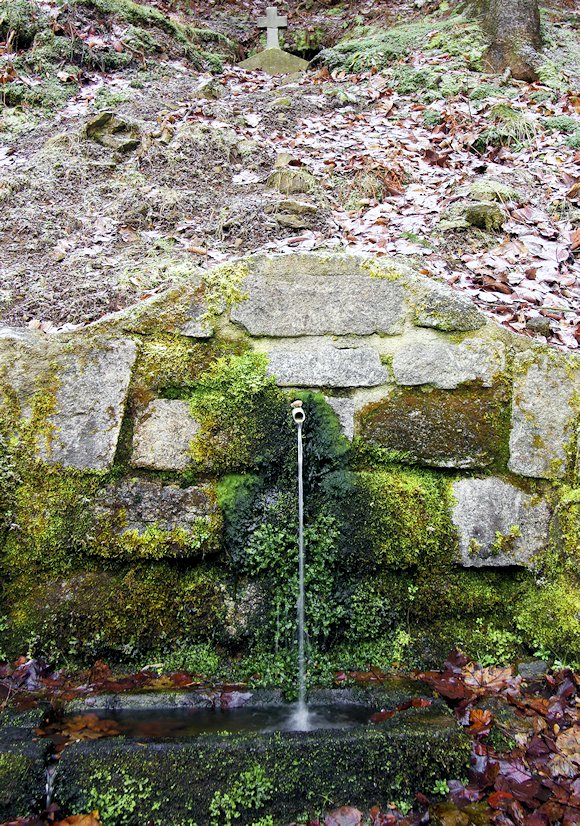 Říjen 2015 - studánka neteče. Jen pár kapek teče po mechu na zdi.