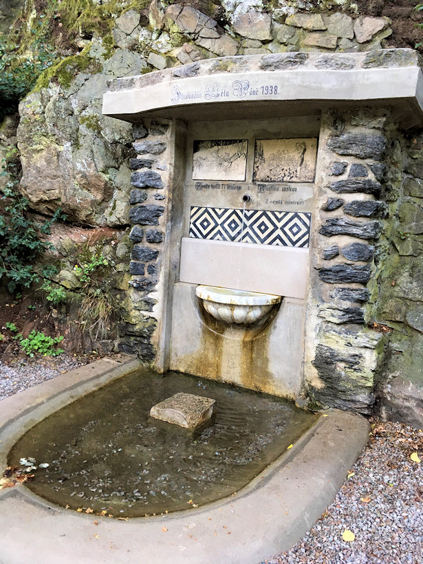 Srpen 2014 - voda jen kape, ale i přesto je chutná. V mušli, kam voda kape, je teplota vody 15,4°C a v nouzi by se z ní voda také dala nabrat.