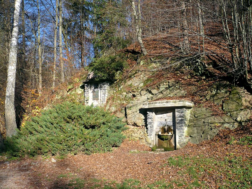 Za Adamovem na zeleně značené stezce směrem na Nový hrad. Pomníček studánky byl navržen profesorem Opletalem v roce 1938 a zdobí jej dva obrazy: jeden, zachycující srnčí zvěř na sněhu, okusující kůru, je opatřen nápisem: "Zvíře budiž ti bratrem", druhý, znázorňující chlapce zalévajícího květinu, je nadepsán: "a rostlina sestrou" (indická moudrost). Vedle studánky je také pomníček Josefa Žalmana (1884 - 1947), ředitele lesních statků a mysliveckého spisovatele. Charakterem patří voda jednoznačně k typu vod hydrouhličitano-vápenatých a je velmi kvalitní - byla využívána i v hájovně. Teď je hájovna zbouraná a voda teče jen do studánky. Protože je voda vedena ze vzdálenější jímky v lese, její teplota, ovlivněná teplotou vzduchu, během roku výrazně kolísá. Obsah rozpuštěných a znečišťujících látek však ovlivněn nebývá. Voda obsahuje méně než 400mg rozpuštěných látek/l a dusičnany vyhovují limitu vody pro kojence. Na studánce můžeme pozorovat rozmanité formy vodního života. Výtoková trubka je oživena jemným nárostem skládajícím se z kolonií sinic rodu Chamaesiphon (obyvatel horských potoků). Tato sinice spolu s ropletenými tenkými sinicovými vlákny vytváří světle hnědý vlhký slizovitý povlak na stěně studánky za tryskajícím proudem vody. Těmto vodním organismům dostačuje vzdušná vlhkost, která je zde vysoká. Mušle studánky je obrostlá zelenými vláknitými řasami a smáčenými mechy bohatě obrostlými rozsivkami a červenými řasami. V bazénku pod mušlí se rychle pohybují korýši blešivci (plavou na boku), ze stěn splývají zelené vláknité řasy a třásně rozsivek téměř všudypřítomné Diatoma vulgaris.
