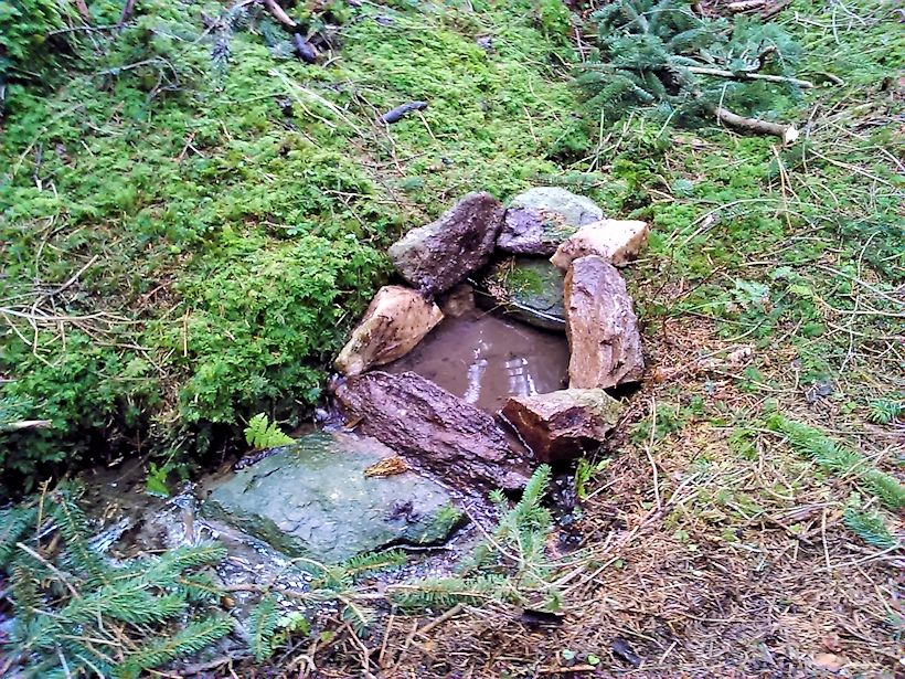 Ve smrkovém lese ve stráni vyvěrá čistý pramínek vody do kamenné studánky.