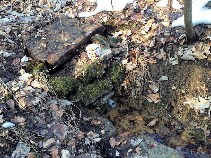 Březen 2020 - studánka už je jen přírodní vývěr ze žíly. Drobátko jsme ji s dětmi očistili od listí a napadaného smetí. Pro zvířata už k pití bude, pro kolemjdoucí pocestné ještě chvilku ne. (Ale máme plán, tak se to třeba brzo změní). Aktuální foto Petr Dubovský