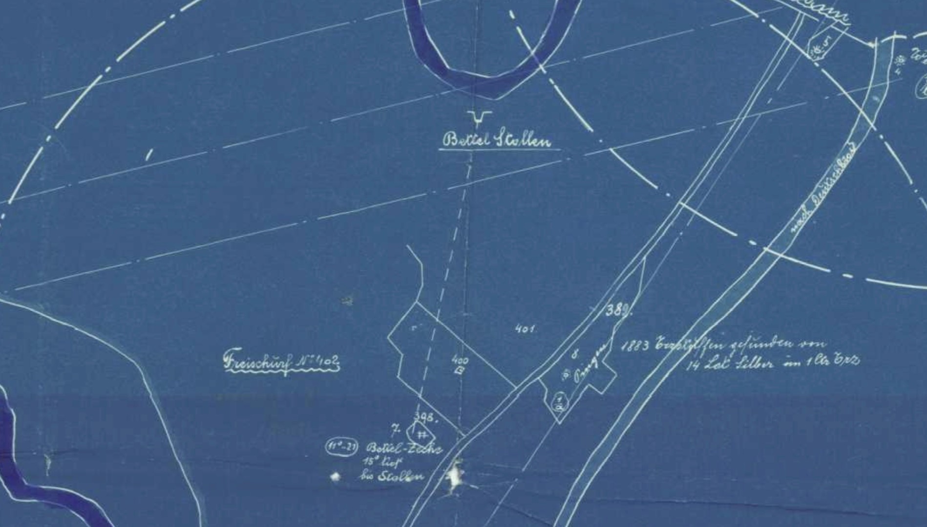 Výtok důlních vod z díla Bettel Stollen. Výsek z mapy typu blueprint, mapa pochází z června 1875. Mapa je nejspíše z plánování železnice Prag - Wien.
