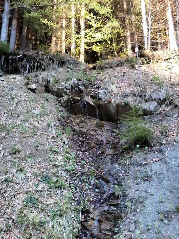 Pramen nad lesní cestou. Foto z listopadu 2025.