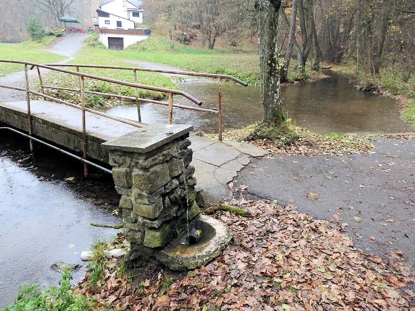 Vrt u vodní nádrže Muchova bouda má dva vývody - jeden je na rozcestí kousek nad údolím a druhý o 100 m dále a níže, u mostu přes Říčku. Voda je hydrouhličitano-vápenatá s mineralizací do 800 mg/l. Neobsahuje žádné nežádoucí látky, i když někomu může chuťově vadit její mírně zvýšený obsah železa (kolem 0,5 mg/l). Obsah dusičnanů je pod 2 mg/l a pro vyšší tvrdost je vhodná na přípravu kávy, u které může mírně tlumit její kyselost. Ve srovnání s většinou pramenů v okolí Brna má nízký obsah síranů. Mikrobiologicky se vyskytují pouze v menší míře psychrofilní a vzácně i mezofilní bakterie. Voda je proto nezávadná. Pod výtokem z kohoutku a na vlhké stěně vegetují sinice a zelené řasy, které obývají povrchové vrstvy půdy a při zvlhčení nebo zaplavení vegetují na jejím povrchu často ve viditelných povlacích nebo koloniích.