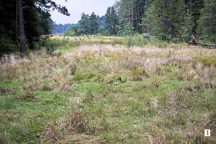 | Obr. 1 - severní cíp prameniště – suchá, později zamokřená louka v pozadí rybník Velký Babín. Vlevo pod stromy zbytky zanikajícího rašeliniště. | Obr. 2 - začátek kdysi přítoku – dnes je koryto zanesené rašelinou a trávou a voda protéká, pokud vůbec, pod povrchem. | Obr. 3 - výtok ze studánky, označené omylem jako pramen oslavy, vydatnost pramene 0,03 l/sec. Výtok je dlouhodobě stálý, voda konzumovatelná a příjemná na chuť. Jde o jedinou studánku v celém prameništi. |