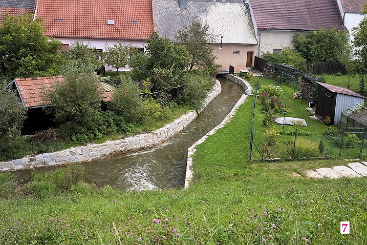 | Obr. 7 - Pod hrází začíná souvislý tok Oslavy. Pokud se rybník zrovna nevypouští, je vody mnohem méně a v případě nadměrného přítoku odtéká přebytek vody přes přeliv – koryto z levé strany. | Obr. 8 - odtok z přelivu a z několika zahrádek. (copak asi z těch trubek teče?) | Obr. 9 - vlastní přeliv. Hladina vody je už několik cm pod normálem. |