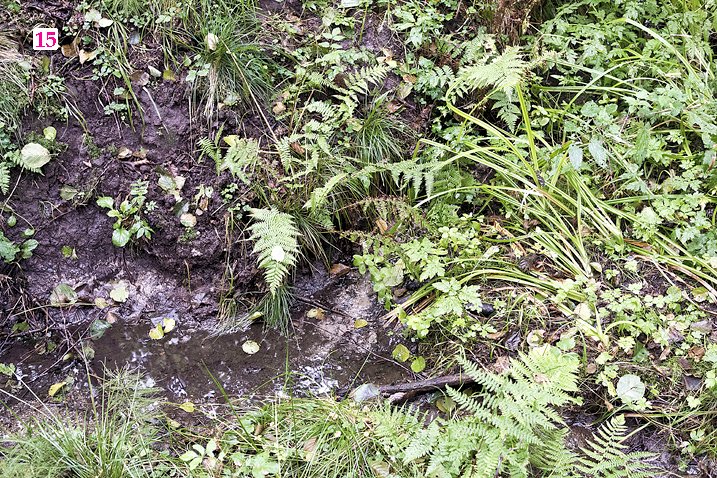 | Obr. 16 - přítok sbírá vodu v této džungli, stružka začíná až vzadu mezi stromy. | Obr. 17 - Patník, zřejmě fungující, jako nivelační bod. Je zajímavé, že bílé značení lemuje převážnou část prameniště. | Obr. 18 - tady všechno začíná, (nebo končí, podle toho ze které strany jdeme). Žádná velká sláva, ale co naděláme. Stružka je občas čištěna, takže vývěru zánik snad nehrozí. |
